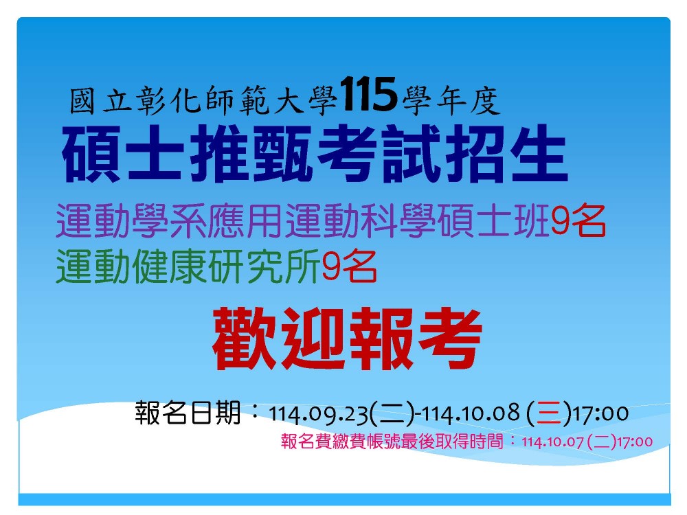【招生訊息】115學年度碩士班推薦甄試「運科碩班」招生9名、「運健所」招生9名。※報名請注意相關時程,報名費繳費帳號取得期限114.10.07(二)下午5時止。
